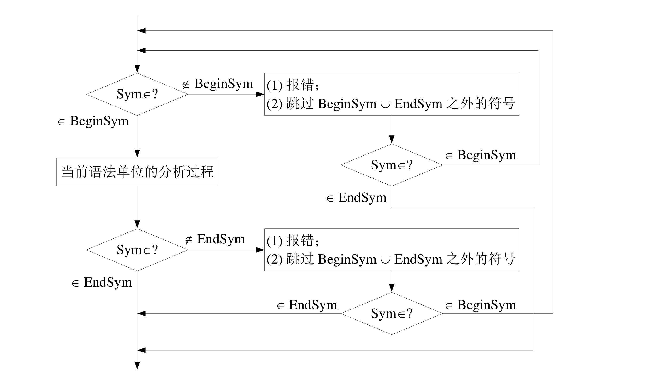 进入时检查 BeginSym,若不属于则报错,滤去补救集合 S(BeginSym 和 EndSym 之并)以外所有符号。
