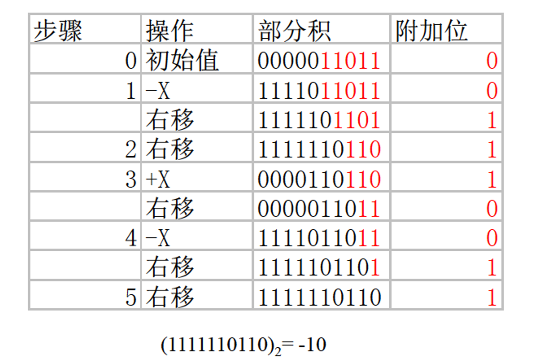 - 部分积部分使用乘法实现 3,红色部分为乘数 -5,黑色部分为部分积。