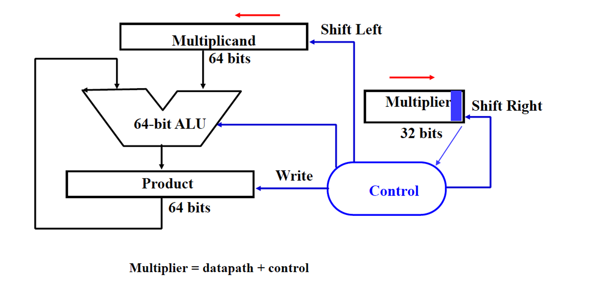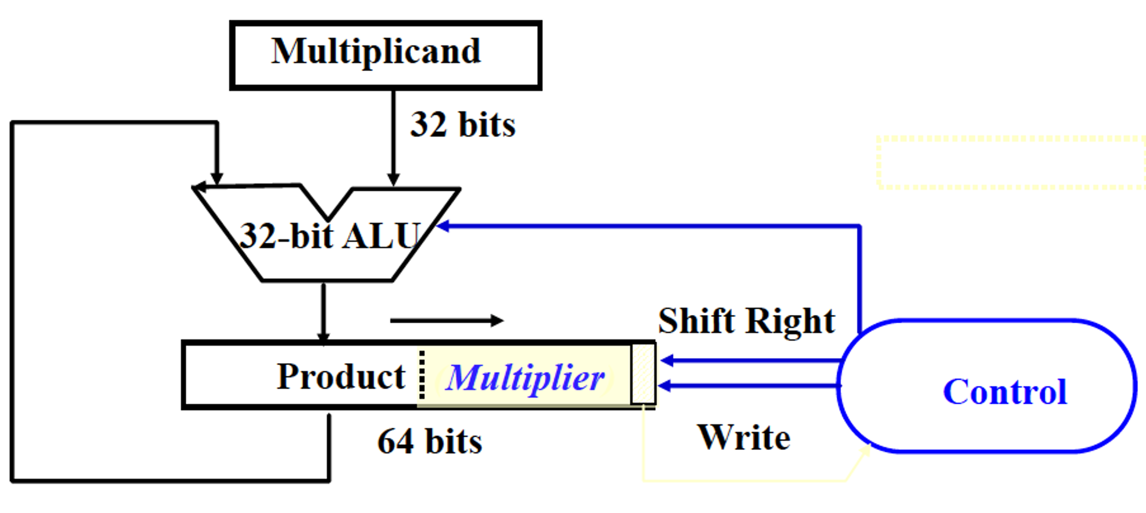 需要 32 位被乘数寄存器,32 位ALU,64 位部分积寄存器。