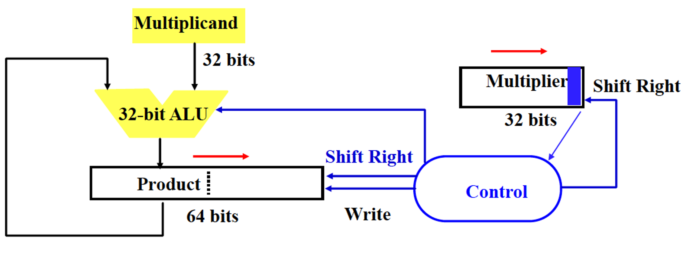需要 32 位被乘数寄存器,32 位ALU,64 位部分积寄存器,32 位乘数寄存器。