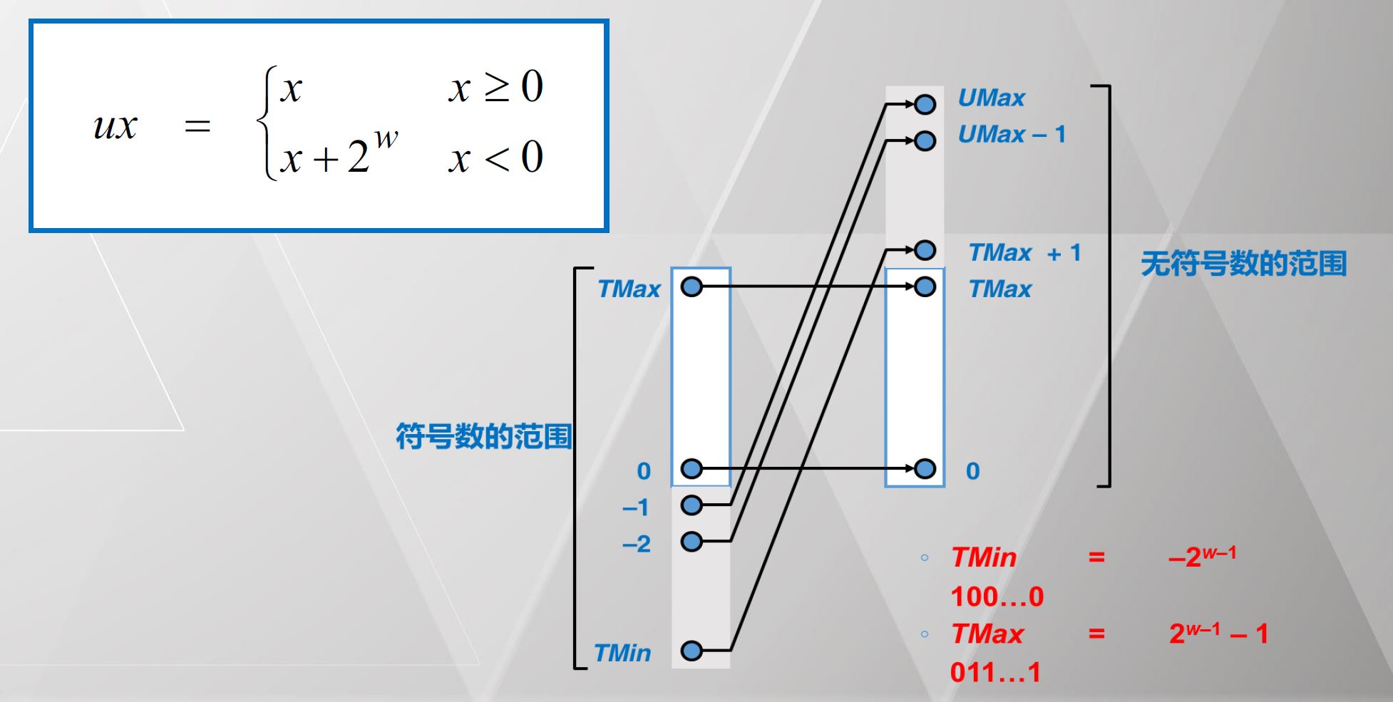 带符号数(补码表示):B2T(X) = -x_{w - 1} \cdot 2^{w - 1} + \sum \limits_{i = 0}^{w - 2} x_i \cdot 2^i