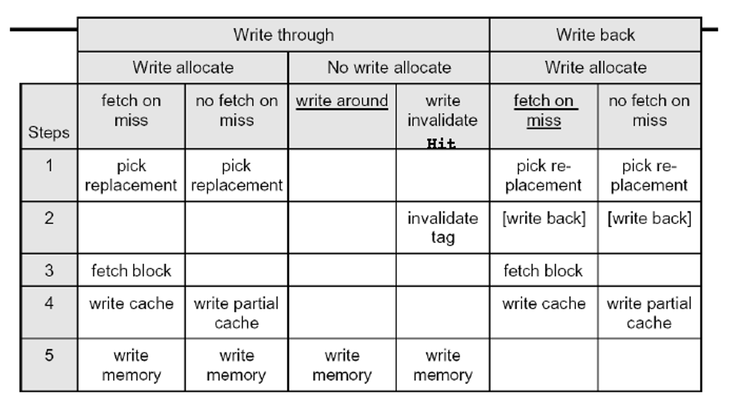 - 写不分配(no write allocate):写完不需要加载进 cache,动机为如果操作系统要写整个数据块,则写完第一个字段就加载是不必要的。