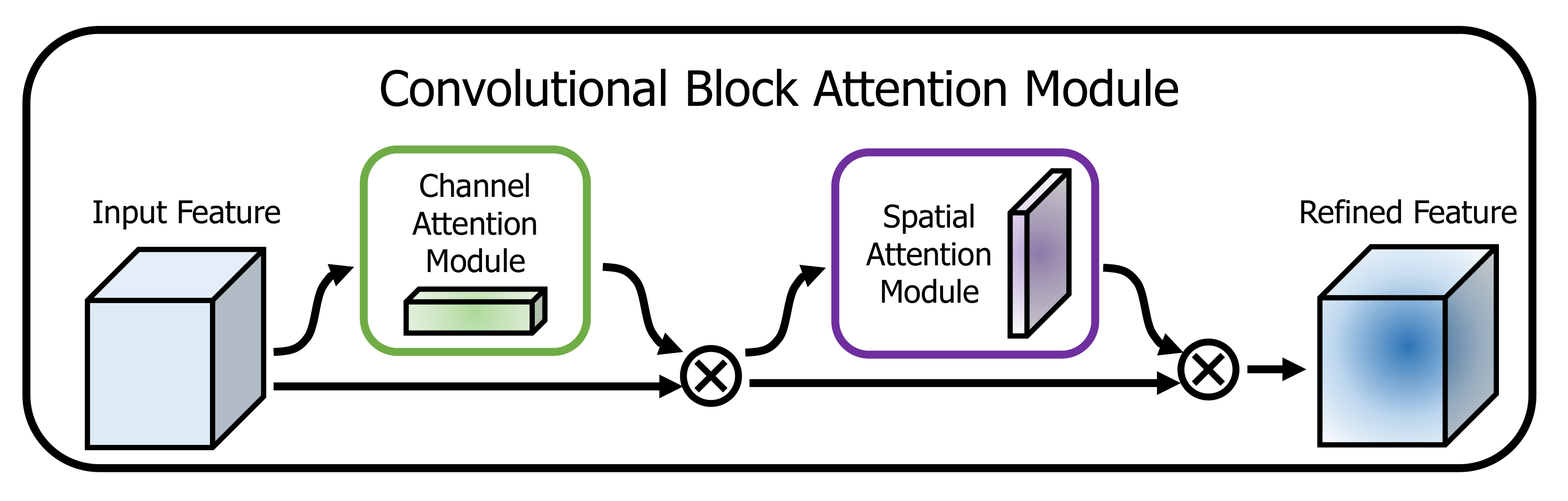 对于给定的中间层特征图 \mathbf{F} \in \mathbb{R}^{C \times H \times W} 输入,CBAM 依次计算 1D 的通道注意力图 \mathbf{M}_c \in \mathbb{R}^{C \times 1 \times 1} 和 2D 的空间注意力图 \mathbf{M}_s \in \mathbb{R}^{1 \times H \times W}。最终得到:
