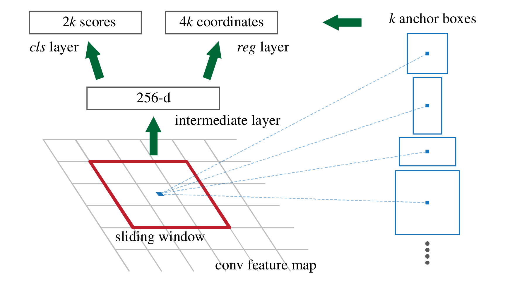 cls layer 分支预测 proposal 是物体和不是物体的分数共 2k 个输出;reg layer 利用锚框为基准预测偏置量共 4k 个输出。